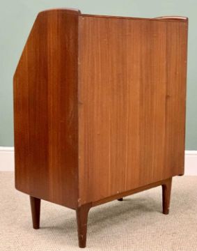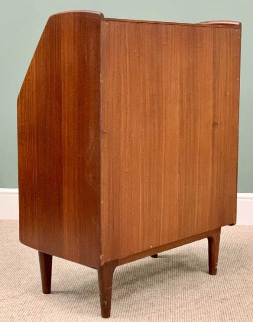 CIRCA 1960s STYLISH DANISH TEAK BUREAU - having a sloped front over three drawers with turned wooden knobs and open leg base, 102cms H, 76cms W, 43cms D