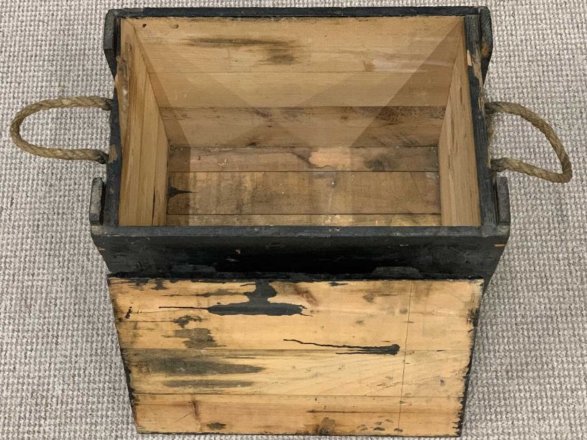 VINTAGE PINE AMMUNITION TYPE BOX - having rope handles, 43cms H, 53cms W, 34cms D and another VINTAGE BOX, labelled "Xcel", 26cms H, 70cms W, 28cms D