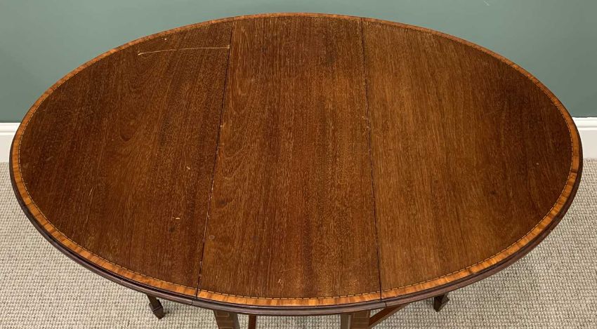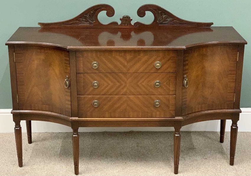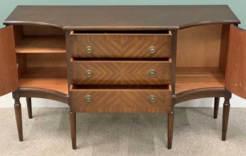 REPRODUCTION MAHOGANY BUFFET SIDEBOARD - having a railback top and three central drawers flanked by two cupboard doors, 77cms H, 130cms W, 46cms D and a MAHOGANY INLAID SUTHERLAND TABLE - 73cms H, 99cmw W, 70cms D (open)