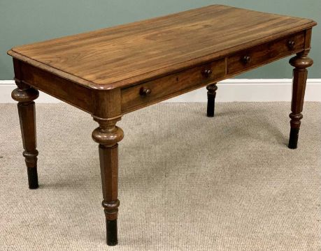 VICTORIAN MAHOGANY LIBRARY TABLE - having a rectangular top with rounded corners, twin frieze drawers and opposing blind drawers with turned wooden knobs, on turned and segmented column supports, the feet possibly cut and now with metal extensions, 75cms H, 148cms W, 74cms D