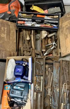 GARDENING & TOOLS - Flymo Speedi-Mo, Black & Decker jigsaw, car polisher, 1945 five gallon jerry can, selection of hand tools contained in two steel cantilever tool boxes, two ammunition boxes and two modern plastic tool boxes E/T