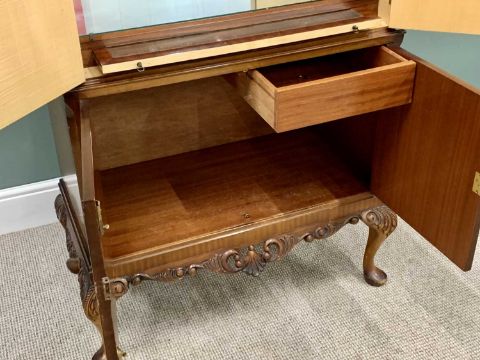 QUEEN ANNE STYLE WALNUT COCKTAIL CABINET - mirrored and fitted interior, central slider and base cupboard doors, on cabriole supports, 160cms H, 91cms W, 60cms D
