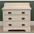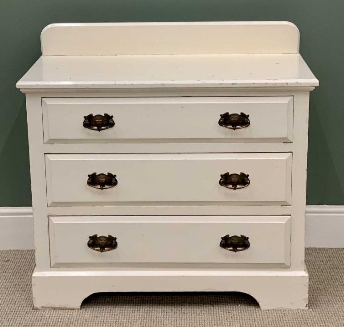 VINTAGE PAINTED RAILBACK CHEST OF THREE DRAWERS - having fancy backplates and swing handles, 89cms H, 92cms W, 41cms D