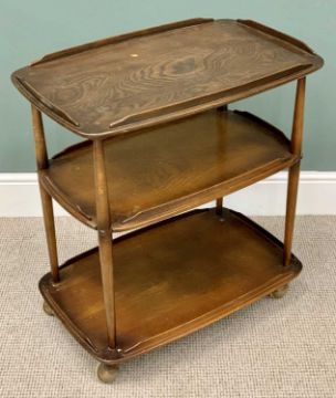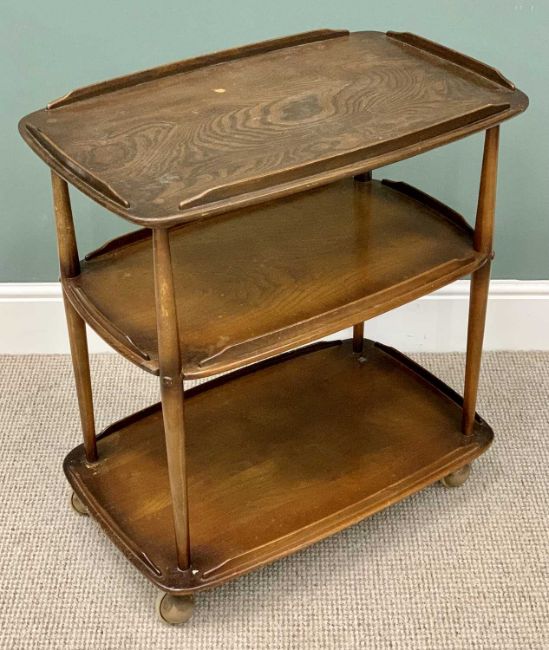 ERCOL VINTAGE THREE TIER TEA TROLLEY - 77cms H, 72cms W, 46cms D and TWO WHEEL & SPINDLEBACK CHAIRS, 84cms H, 40cms W, 33cms D