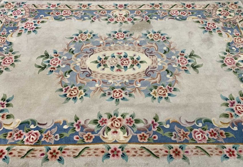 CHINESE WASHED WOOLLEN RUG - cream ground with colourful floral borders and central floral motif with blue background, 272 x 182cms