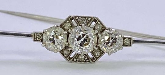 UNMARKED WHITE GOLD OR PLATINUM DIAMOND SET BAR BROOCH - having a central 0.50ct round cut diamond flanked by two 0.33ct diamonds and a further 8 small diamonds to an Art Deco style background setting, 5.5mm approx the central stone, 56mm L the brooch, 5.5grms, presented in a velvet lined Goldsmiths and Silversmiths Company Ltd box