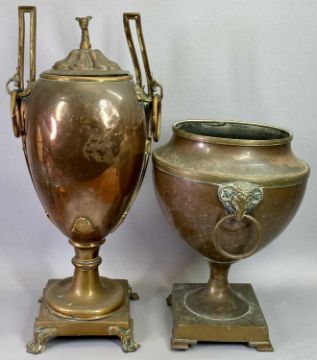 A REGENCY COPPER SAMOVAR - with ovoid body, bar and ring handles, on square base with scrolled feet, the cover with dog head finial, 53cms H, another Regency copper samovar, baluster body with square foot and with elephant mask and ring side handles (lacking cover), 34cms H, a pair of 19th Century cast candleholders, the stems modelled as knights on raised circular platform bases, 22cms H, other items of brassware, metalware and four table lamps