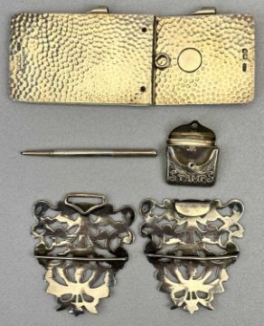 SILVER & WHITE METAL BIJOUTTERIE ITEMS (4) - to include a beaten silver notepad holder and pencil, London 1903, Maker John Collard Vickery, 8.75 x 5.25cms, two part silver nurse's buckle, Birmingham 1898, Maker possibly John Culver, 12cms overall L, small envelope form holder embossed with the word 'stamps', Birmingham 1904, Maker Crisford & Norris Ltd, 2.5cms across, along with a chrome plated stamp holder, to hold four stamps, sprung hinge and hanging loop, 4.75 x 3.5cms