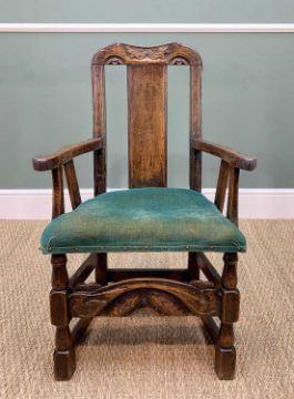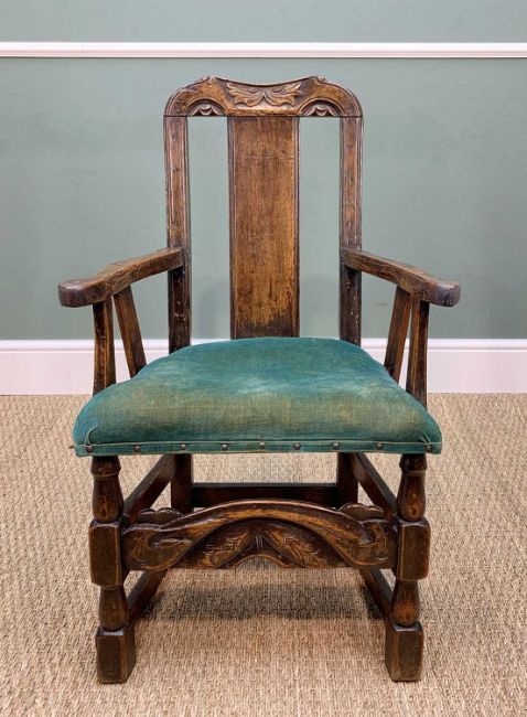 RARE WELSH JOINED OAK CHILD'S ARMCHAIR early 18th Century and later, believed Carmarthenshire, carved top rail and stretcher, cushioned stuff-over seat