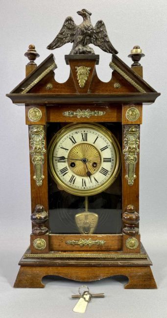 AN AMERICAN MANTEL CLOCK - Late 19th Century, mahogany and pine case with brass mounts, glazed door enclosing circular dial with black Roman numerals and gilt pendulum, eight day movement striking on a gong with eagle finial, paper label to the reverse 'W G Hicks, Redruth', 52cms H, 27cms W, 11cms D