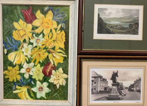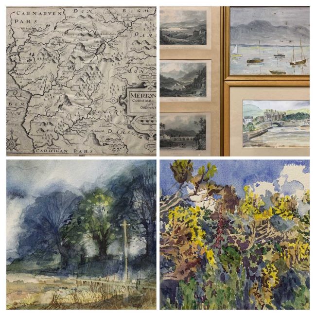 19TH CENTURY COLOURED ENGRAVINGS (3) - Bala Lake, Snowdon and Dolgellau, contained in a frame, 43.5 x 21.5cms, an antique black and white map - Meirionnydd by Kip, 33 x 36.5cms and JOHN LIDZEY watercolour - telephone line to trees, signed lower right, 21 x 32cms, and a large quantity of other framed and glazed prints and pictures