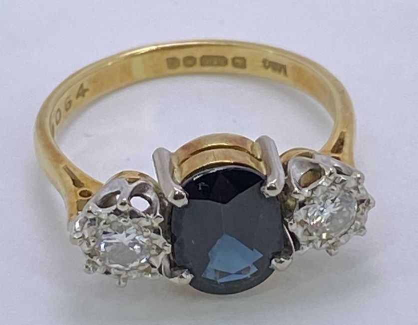18CT GOLD & PLATINUM 3 STONE DARK BLUE SAPPHIRE & DIAMOND RING - 9 x 7mm the central stone, flanked by 2 x 0.20ct diamonds, Size mid N-O, 4.3grms (J25)