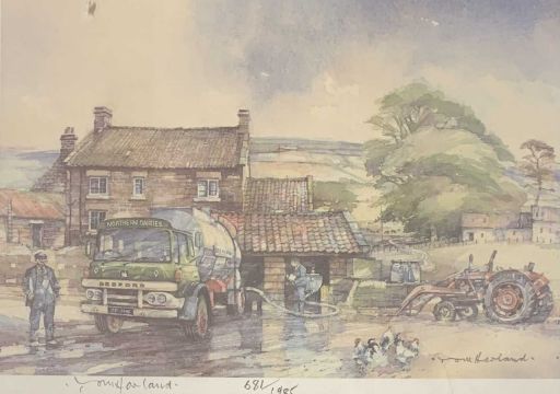 TOM HARLAND limited edition prints (6) all with matching frames, all signed and numbered, 'Milk delivering during the Blitz', 1606/2262, 'Springtime in the High Fells' 1315/2185, 'Collecting Empties' 599/2000, 'Bulk Milk Collection' 681/1985, 'Autumn Sunshine in the Dales' 1500/2140 and 'Summer Seclusion in the Dales' 372/2220, 19 x 26.5cms