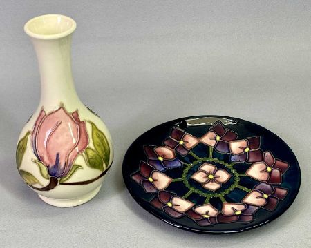 MOORCROFT PINK MAGNOLIA VASE - on cream ground with slender neck, impressed marks, 18cms H and a modern Moorcroft circular shallow dish incised with stylised flowers on a blue/green ground, impressed marks, 15.5cms diameter