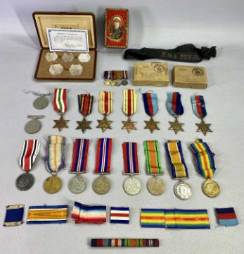 WW1-WW2 & RELATED ITEMS, MEDALS COLLECTION WITH COINS - to include a 1914-1919 Victory medal awarded to 30087 Pte F Hewetson. G. GDS, WW1 pair of Campaign and Victory medals awarded to 438360 SPR F Hartley. R. E, thirteen further medals, all unmarked to include 3 x 1939-1945 Stars, 2 x Africa Stars, 1 x Italy Star and 1 x Burma Star, 4 x 1939-1945 Campaign medals and 2 x 1939-1945 Defence medals, set of four WW2 miniatures, ribbon bar and further ribbons, 2 x OHMS postage boxes addressed to Mr J Winstanley, Highfield Wigan and Mr C Hughes, Llanfairfechan, North Wales, HMS Punjabi cap ribbon, 1938 German Civil Defence/Air Raid medal, possibly a copy, and a cased set of six Korean 10th Asian Games coins in presentation box marked 'Seoul 1986'