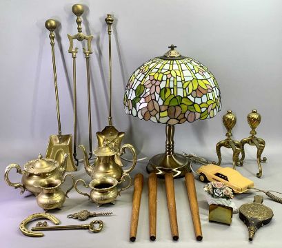 TABLE LAMP WITH TIFFANY STYLE SHADE, 38cms diameter, a Betacom Betacar novelty telephone, brass companion set, ETC