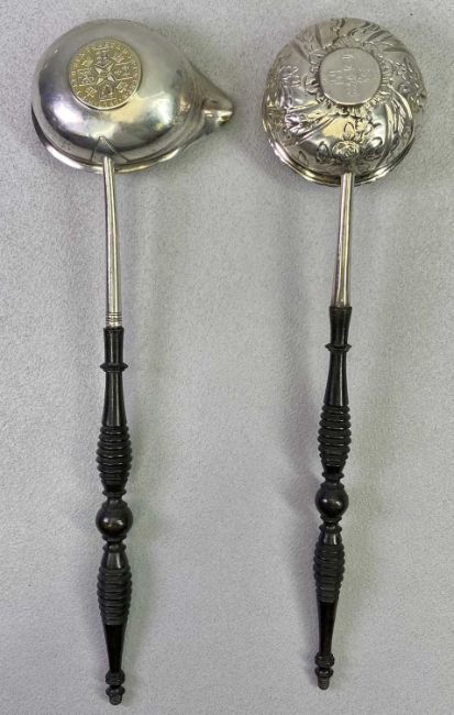 UNMARKED WHITE METAL TODDY LADLES (6) - to include 2 x inset coin bowl examples with turned wooden handles, 27cms approx lengths, one circular with embossed decoration, one plain with pouring lip, a matching pair and two others, all with circular bowls and twist baleen handles, 22cm lengths the pair, 21.5 and 20cm lengths the others