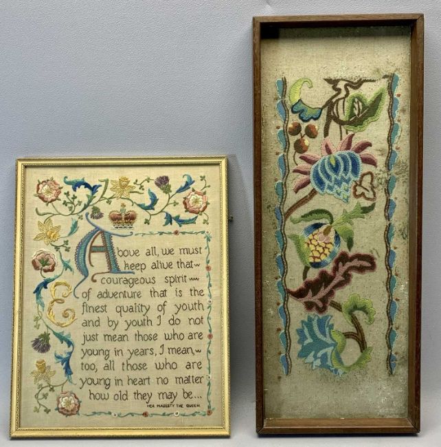 A CREWEL WORK TYPE NEEDLEWORK PICTURE, 19th century, finches and flowers, 56 x 37.5cms, a similar needlework picture of a jug with autumnal leaves, 51.5 x 41.5cms and three other embroidered pictures