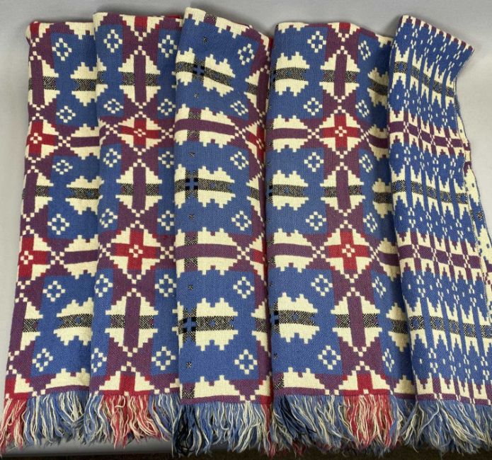 TRADITIONAL WELSH WOOLLEN BLANKET - tassel ends, ground blue and cream with red and purple, 228 x 140cms