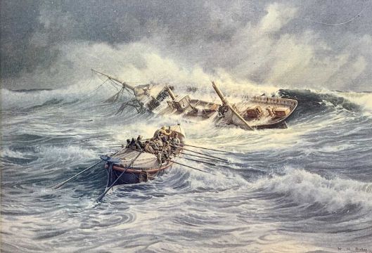COLOUR PRINTS, A SET OF 6 - lifeboats, 14 x 20cms, four similar prints, 12 x 17cms, GORDON CLOSE acrylic oil on canvas - Edwardian street scene, 29.5 x 39.5cms, ETC