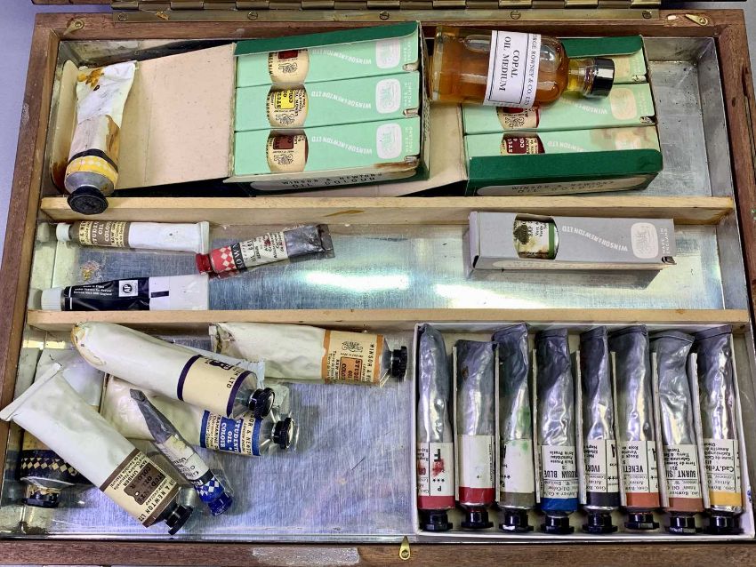 19TH CENTURY LEATHER HAT BOX - various part labels including GWR, former owner's name 'Ethelston' together with a mid-century artist's box with 27 tubes of Reeves and Windsor and Newton tubes of oil paint