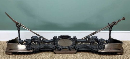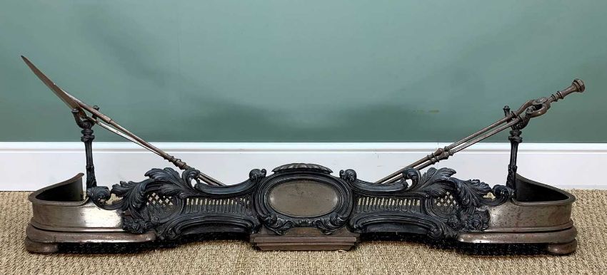 VICTORIAN STEEL ROCOCCO FORM FENDER, with two slot-in arms, and set of 19th century steel fire irons, fender 137cms wide x 37cms deep