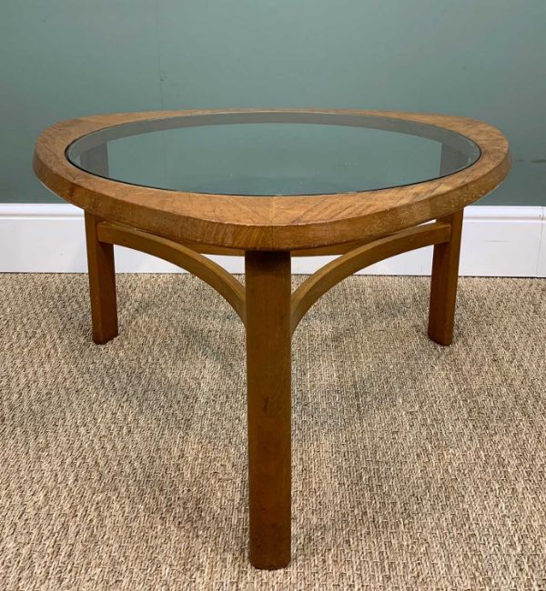 VINTAGE NATHAN TEAK 'ASTRO' COFFEE TABLE, c. 1970s, with inset glass top 76w 44h cmsComments: minor marks, blemishes and watermark stains
