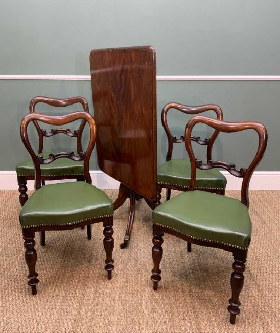 GEORGE IV MAHOGANY BREAKFAST TABLE, & SET OF FOUR VICTORIAN WALNUT DINING CHAIRS, with buckle backs, scrolled crossbars, stuffover serpentine seats, baluster legs, 89w x 74d x 71h cms