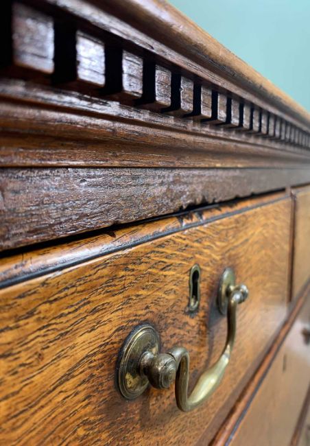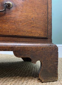 19TH CENTURY OAK FLAT FRONT CHEST, dentil cornice, fitted 2 short and 3 long drawers, bracket feet, 99w x 50d x 107h cms