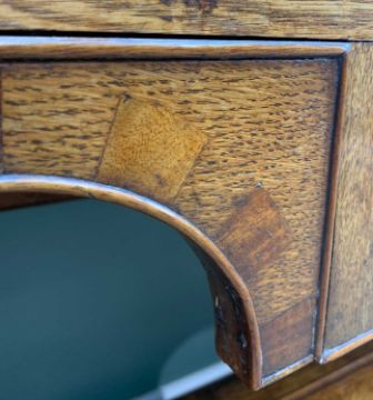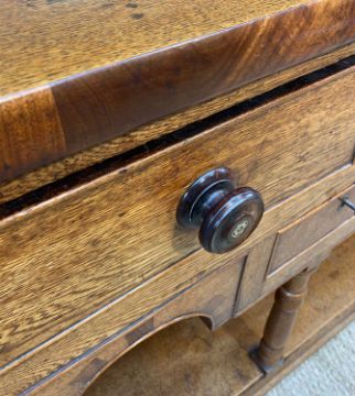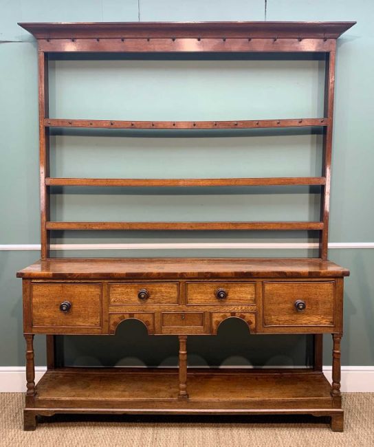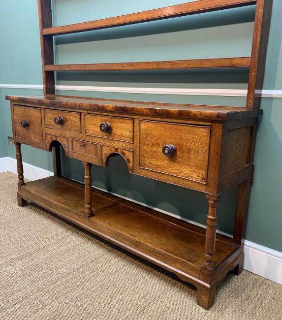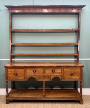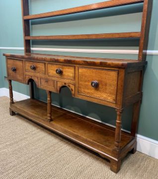 GOOD 19TH CENTURY OAK SOUTH WALES HIGH DRESSER, angled cornice above open delft rack with 3 shelves, the top with mahogany edge above arrangement of 5 drawers and 2 chequer banded under arches, baluster supports, potboard base, slim bracket feet, 195w x 43d x 233h cms