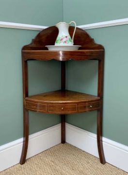 EARLY 19TH CENTURY MAHOGANY CORNER WASH STAND, with associated Copeland floral painted water jug and basin, 100cms high overall (3)Provenance: The estate of Eileen Price McWilliam, Welsh opera singer and RWCMD tutor.