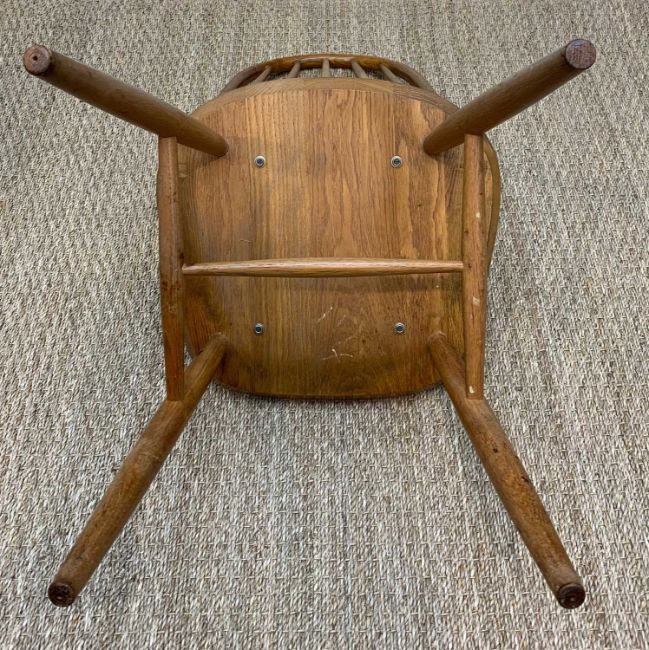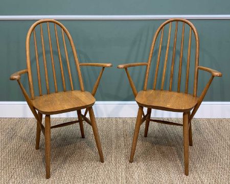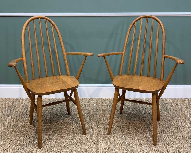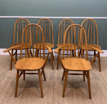 SET SIX PRIORY OF MANCHESTER ERCOL-STYLE WINDSOR DINING CHAIRS including two armchairs, solid ash and beech, natural finish, 97h x 44cm w (arm 67cm w) (6)