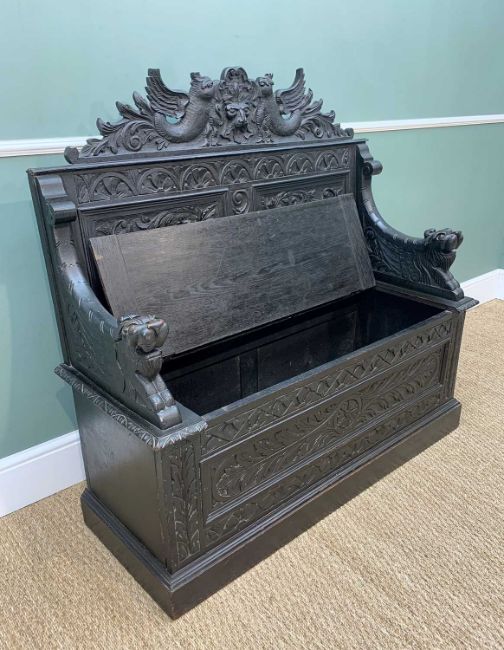 STAINED OAK BOX SETTLE, carved in the Renaissance revival style with Griffin and mask panelled back, lion carved arms and foliate carved front, 122cms wide, together with a similar hinged top coffer with carved panelled front and green man mask uprights with fruit, 107cms wide (2)Comments: settle with missing tops to carved cresting rail, coffer with shrunk timbers and worn topProvenance: Davey family of Whitford House, Penrhiwgoch, Baglan/Briton Ferry.