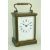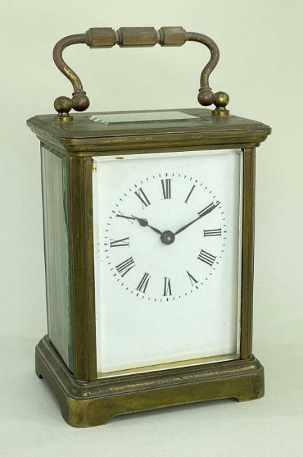 BRASS CARRIAGE CLOCK, white enamel Roman dial, five bevelled glass windows, 10.5cm h (excl handle)Comments: case worn, winds but stops shortly.