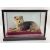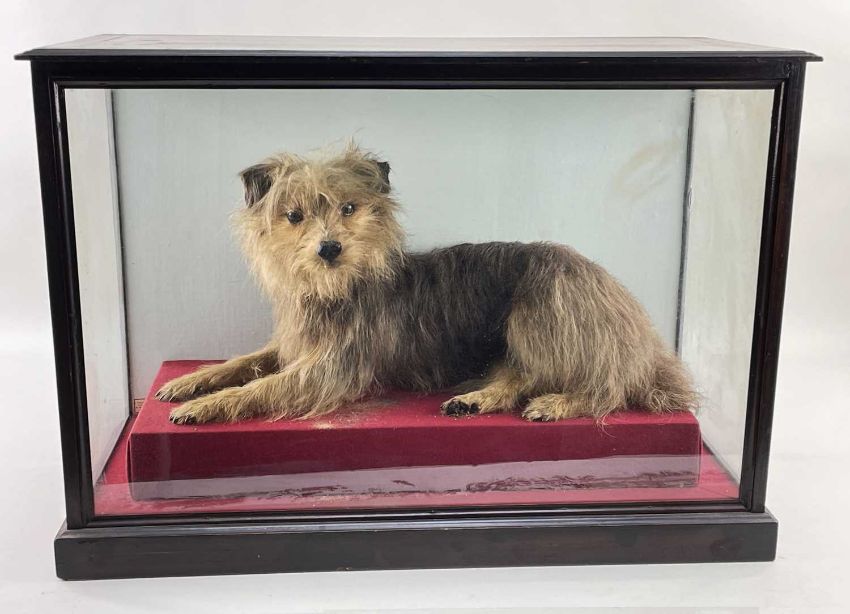 ANTIQUE EBONISED & GLAZED TAXIDERMY CASE OF A TERRIER, recumbent on raised red base