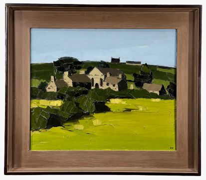 SIR KYFFIN WILLIAMS RA oil on canvas - landscape with fields and village to the centre, including chapel, under a blue sky, signed with initials, circa 1960s, 50 x 60cms