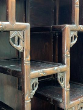 CHINESE CARVED HARDWOOD DISPLAY CABINET, faux bamboo carved case with pierced cornice, glazed door and cupboard base with fruiting vine carved panels, pierced apron, scrolled legs, 215h x 83w x 38cms
