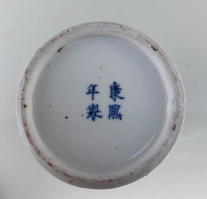 PAIR CHINESE BLUE & WHITE PORCELAIN VASES & COVERS, late Qing dynasty or later, each painted with flowering prunus trees, domed covers with dog of fo knops, bases with apocryphal 4-character Kangxi marks, 30.5cm h (2)Comments: one vase with rim chip, other with glaze flake chip to foot, one cover chipped and reglued.