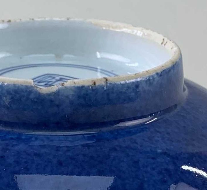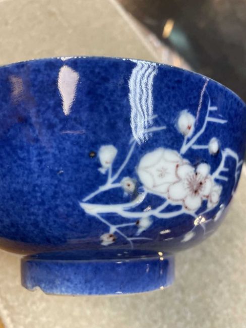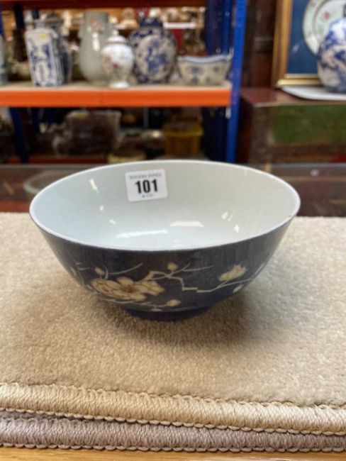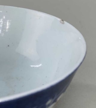 CHINESE COPPER RED & POWDER BLUE PORCELAIN BOWL, Kangxi, painted with two spays of flowering prunus, single character seal mark in a double circle, 15cm diam.Provenance: private South Wales collection.Comments: chips to rim & foot.