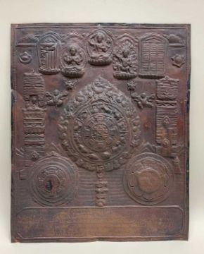 TIBETAN COPPER MANDALA PLAQUE, 20th Century, repousse-decorated with a seated bodhisattvas above flaming mandala framing circular zodiac, further panels below engraved in sanscrit, 36 x 29.5cmComment: minor dents, perimeter with pinholes.