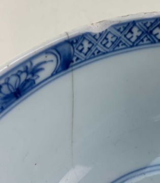 CHINESE BLUE & WHITE PORCELAIN BOWL, Kangxi, centre painted with an official wearing futou beside two rattan bound jars, outside painted with an official on horseback visiting elegant lady in a rickshaw beside attendant with wine tray, Ruo Shen Zhen Cang mark in double circle, 18.8cm diamProvenance: private South Wales collection.Comments: three cracks and chips, fritting, centre glaze worn.