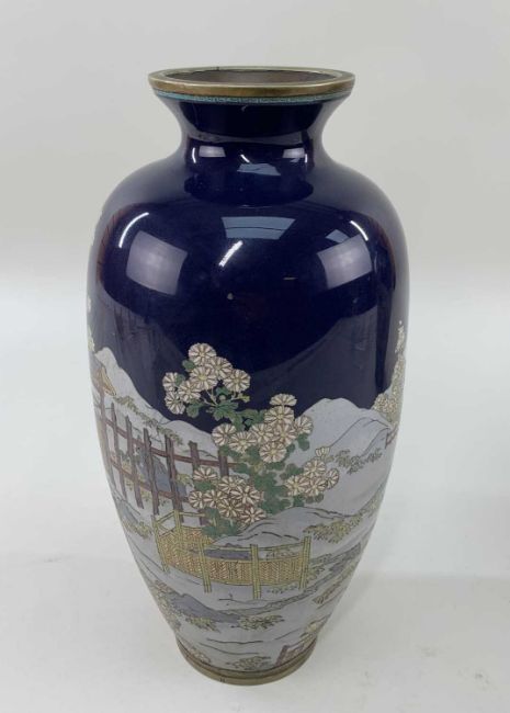 PAIR JAPANESE CLOISONNE ENAMEL VASES, Meiji Period, well-decorated with a garden gate, and with a cart laden with flowering kiku, set in landscapes, bases with engraved metal footrims, 30.5cm h (2)Comments: both with slightly impacted sides and resulting star cracks, one with loose metal rim.