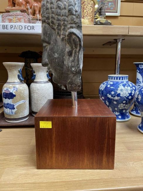 GANDHARA STYLE GREY STONE HEAD OF BUDDHA, carved with braided hair and topknot, downcast serene expression, 26cm high, on hardwood plinth base, overall 43cm high