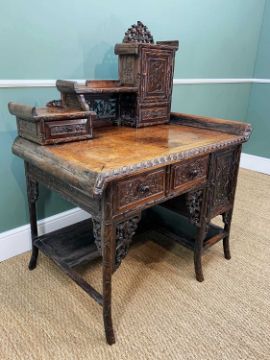CHINESE HARDWOOD WRITING DESK, asymmetric form with carved simulated bamboo frame, raised superstructure of drawers, shelves and cupboard, above inset panelled top, two frieze drawers and side cupboard, splayed legs joined by platform stretchers, 102w x 70d x 133cm h