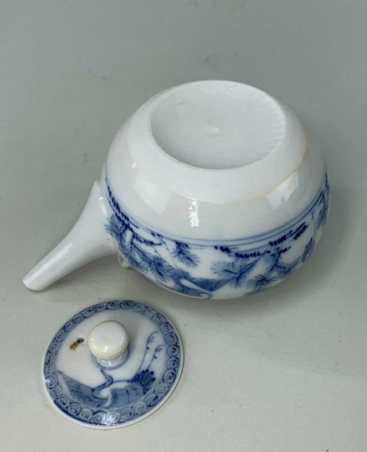 FOUR JAPANESE BLUE & WHITE PORCELAIN VESSELS, comprising globe & shaft vase painted with bird, peony & morning glory, 28.5cm h; ovoid jar painted with peony & prunus, 17cm h; teapot painted with tsuru and pine, 15cm long; and globular jarlet with 8 flat sides, 8cm h (4)