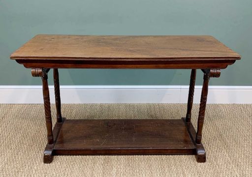 ANGLO-CHINESE PADOUK SIDE TABLE, rectangular moulded top on scrolled bracket supports, on four twist columns joined by platform stretcher and sleigh feet, 19th Century and later adaptions, 122 x 53 x 69cmsComments: light surface scratches to top, base with more substantial scratches/wear, old damage/restoration to underneath of 1 foot, other feet worn and possibly reduced.