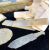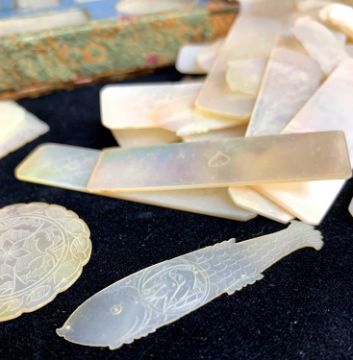 BOXED & LOOSE CHINESE MOTHER OF PEARL GAMING COUNTERS, comprising a silk brocade covered box with glass cover fitted with 11 receptacles for broad and narrow rectangular and circular counters, all engraved with figures in landscapes (app 88), and an assortment of loose fish and other shaped counters (qty)
