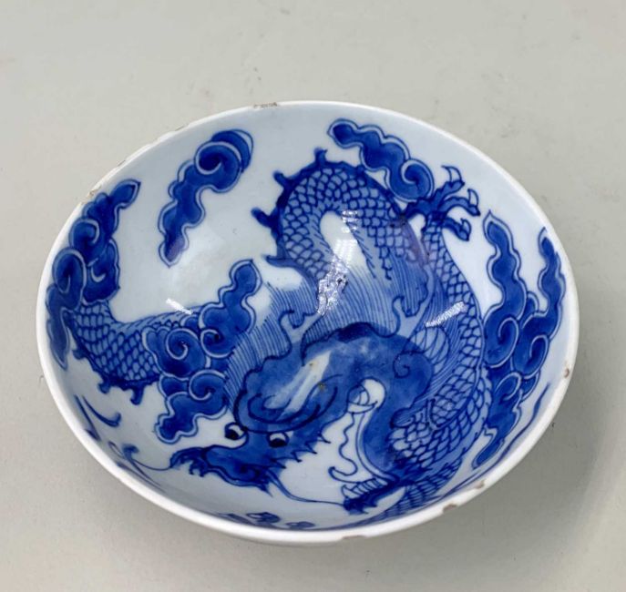 PAIR CHINESE BLUE & WHITE PORCELAIN 'DRAGON' BOWLS, Yongzheng 6-character marks, both inside and outside painted with sinuous 4-clawed dragon pursuing the pearl amid clouds, 11.5cm diam (2)Comments: fritting to both and rim chip to one, both with additional later stippled character to undersided.Provenance: private collection South Wales