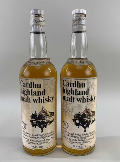 TWO BOTTLES OF CARDU HIGHLAND MALT WHISKY both 26 & 2/3 fl.oz 70° indicating pre-1980 bottlingsComments: fill levels are excellent, labels are stained and have minor damage, one capsule seal is broken
