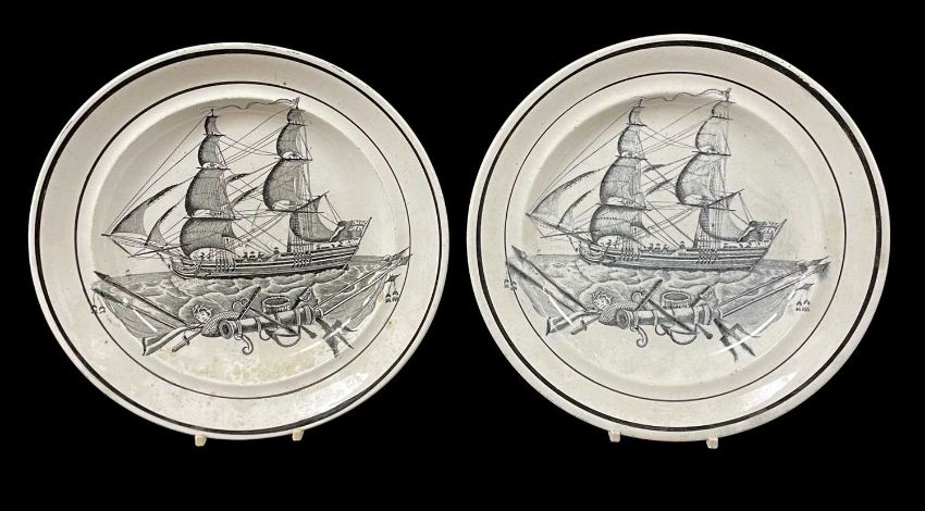 PAIR OF SWANSEA DILLWYN SHIP TRANSFER PLATES black/grey transfer of two-mast British naval ship and with canon, anchor, swords etc to foreground, one with Dillwyn horseshoe mark, 23cms diam